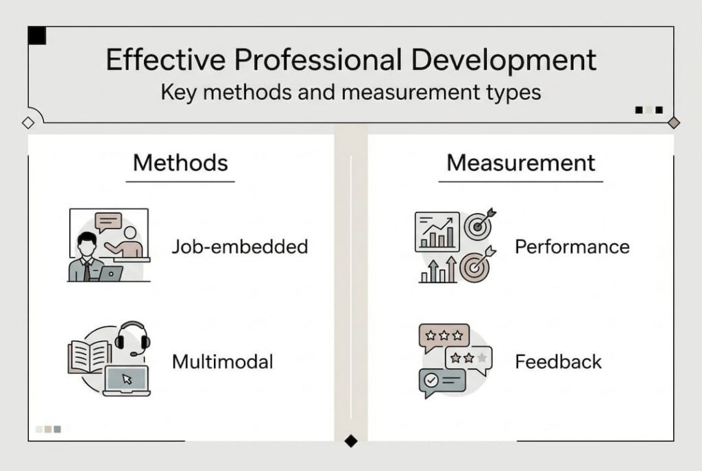 Research shows that job-embedded and multimodal methods yield medium to large effects when properly designed and implemented. These approaches outperform standalone workshops because they integrate learning with authentic work contexts and provide sustained support for application. However, even well-designed programs only impact outcomes when four essential conditions align.